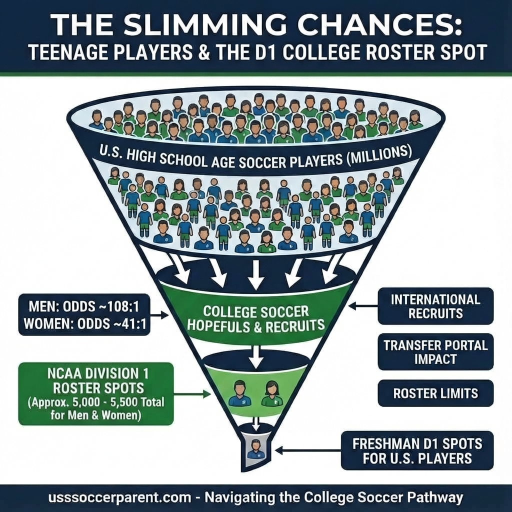 • Soccer is an equivalency sport: even at D1, many rostered players receive partial or no athletic aid, so the odds of “playing in college somewhere” are meaningfully higher than the odds of landing a heavily funded D1 scholarship.