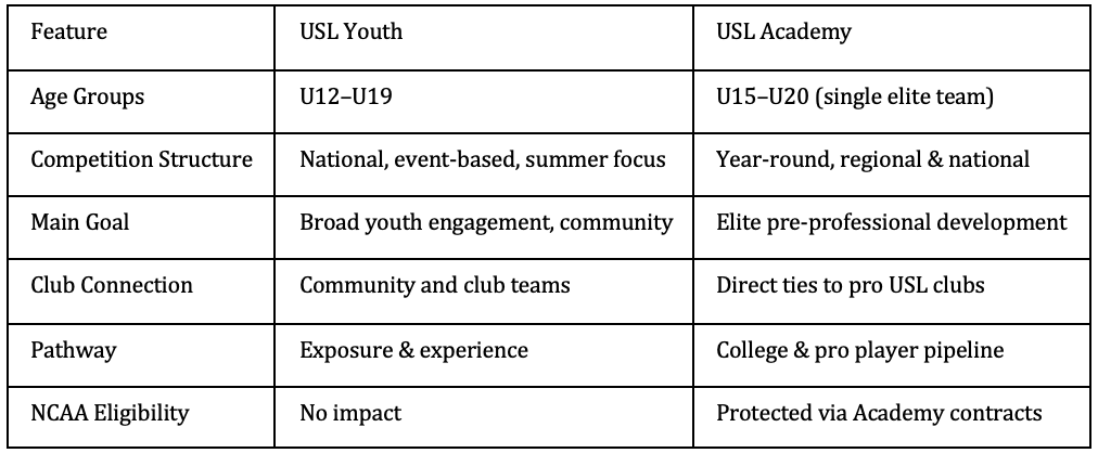 USL Youth is ideal for club players who love competition, want a taste of national events, or want to stay sharp off-season. USL Academy is for those on the cusp of a potential college or professional career, offering the closest step to the “big leagues” within the USL system—with real, structured support along the way.